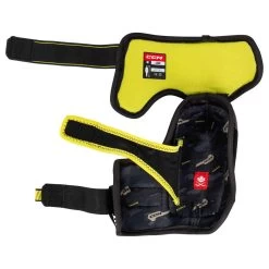 - Forearm protected by tough injection-molded Slash Shield/sublimated liner